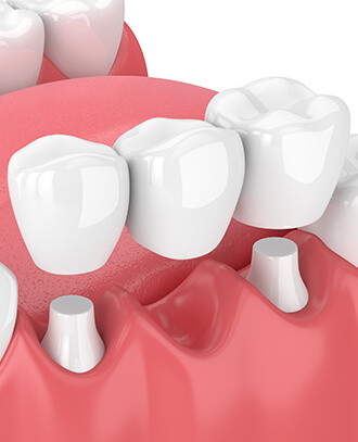 A dental bridge is a restorative treatment used to replace one or more missing teeth. The bridge typically includes a replacement tooth (or teeth) held in place by dental crowns on the neighboring teeth. This structure “bridges” the gap left by missing teeth, restoring your smile and bite.